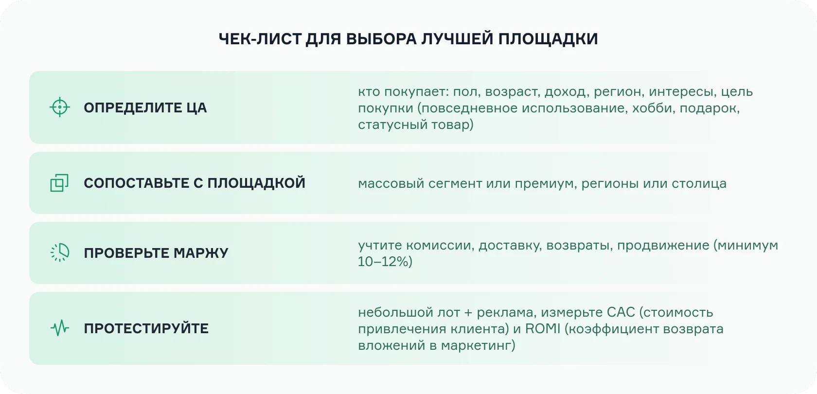 Выбор маркетплейса начинается с ответа на три вопроса: кто ваша целевая аудитория, какие товары вы продаёте и в какой модели готовы работать (FBO, FBS, дропшиппинг). Так вы сразу отсечёте неподходящие площадки и сможете сосредоточиться на тех, где продукт лучше «вписывается» в покупательский путь и в коммерческие условия.